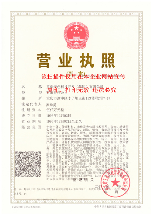 重慶綠色科技開發(集團)有限公司成立以來,除從事LED照明研發、推廣外,主要推廣LED路燈照明合同能源管理(EMC)項目、節能減排技術以及節能項目設計、融資、改造(包括施工、設備安裝、運營管理)等服務,已形成集咨詢服務、設計、銷售、工程實施和技術推廣于一體的經營模式。